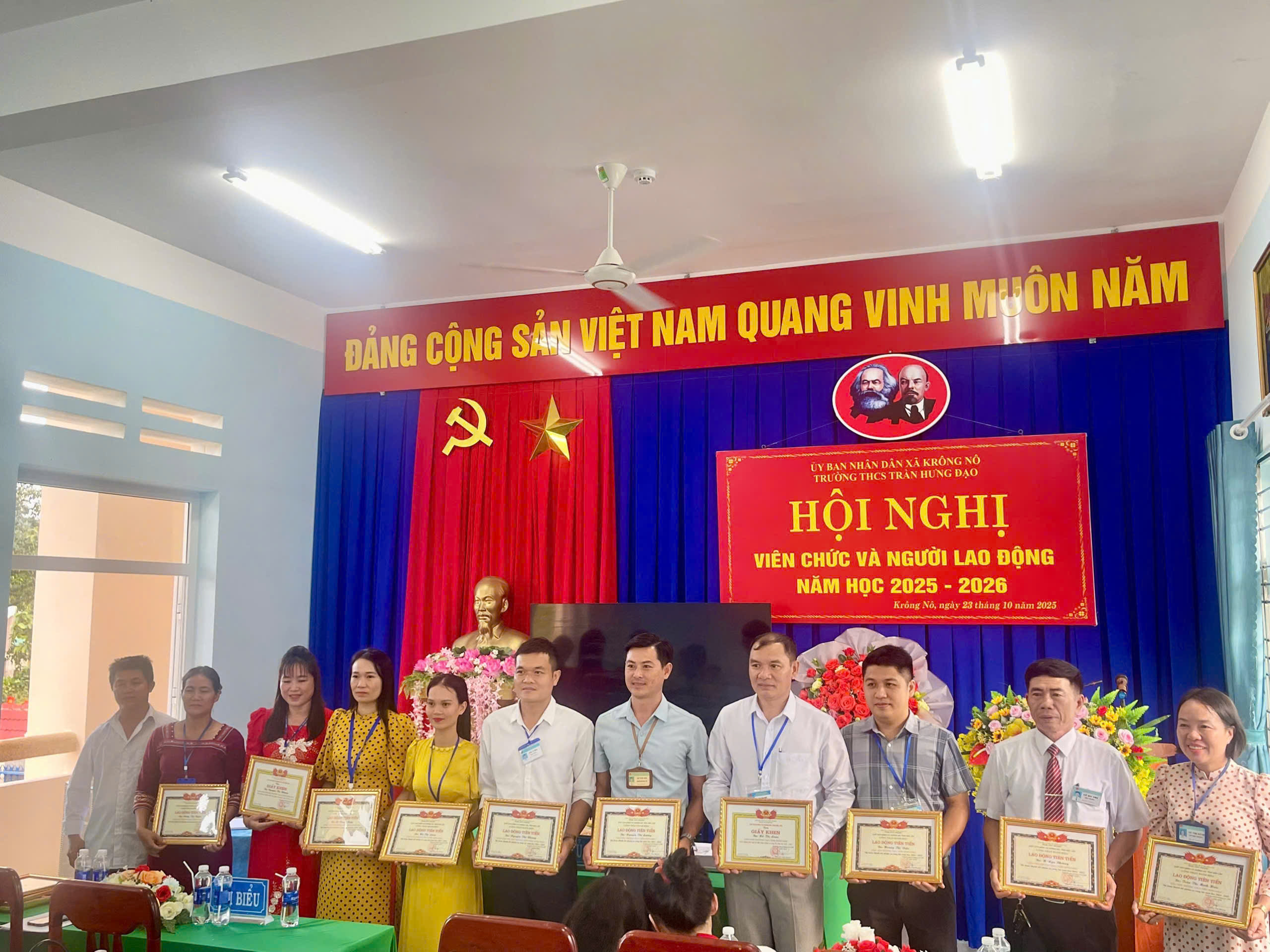 Hội nghị cũng đã công bố các quyết định khen thưởng và trao giấy khen cho những viên chức, người lao động có thành tích xuất sắc trong năm học 2024–2025. Đồng thời, đồng chí Vũ Thị Hằng phát động phong trào thi đua năm học 2025–2026, kêu gọi toàn thể nhà trường tiếp tục nỗ lực, sáng tạo và đổi mới.